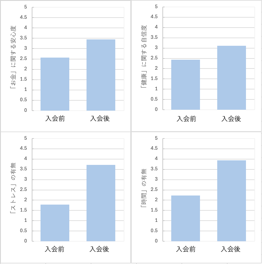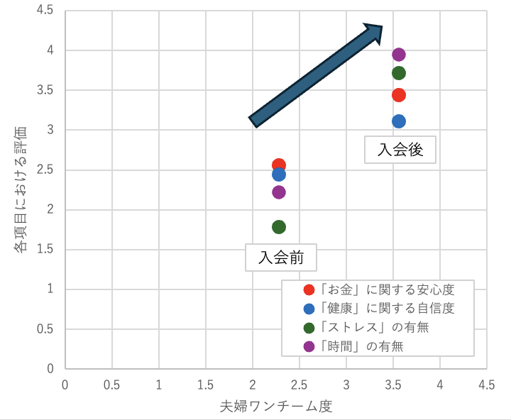 下の図は、入会前と入会後で夫婦ワンチーム度がどれくらい変化し、それに伴って「お金」「健康」「ストレス」「時間」の安心度や自信度がどれくらい上がったのかを示したものです。